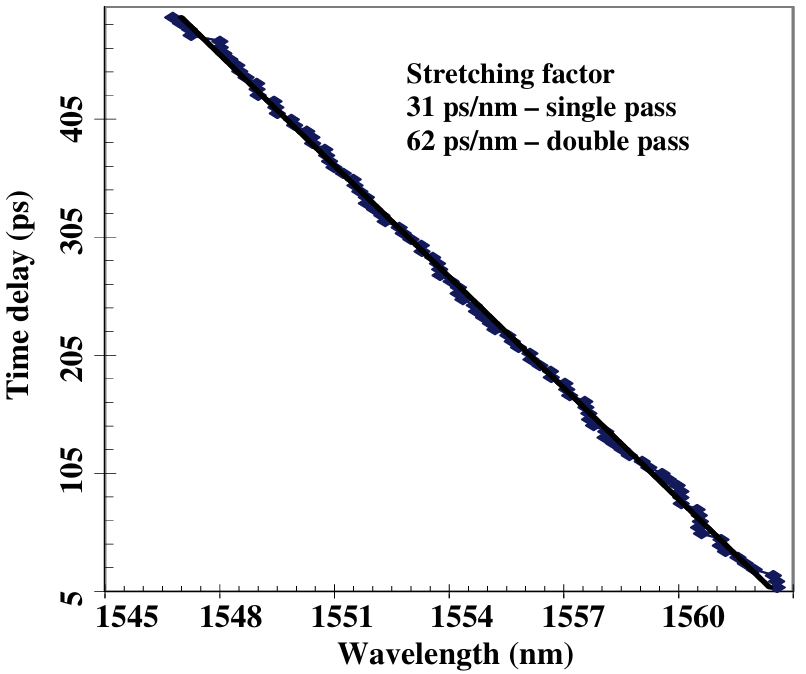 图4:中心波长为1555nm、厚度为50mm的CBG的时间延迟与波长的关系(时间延迟色散),SCR为3.2 nm/cm。直线表示线性色散,方块表示实验数据。