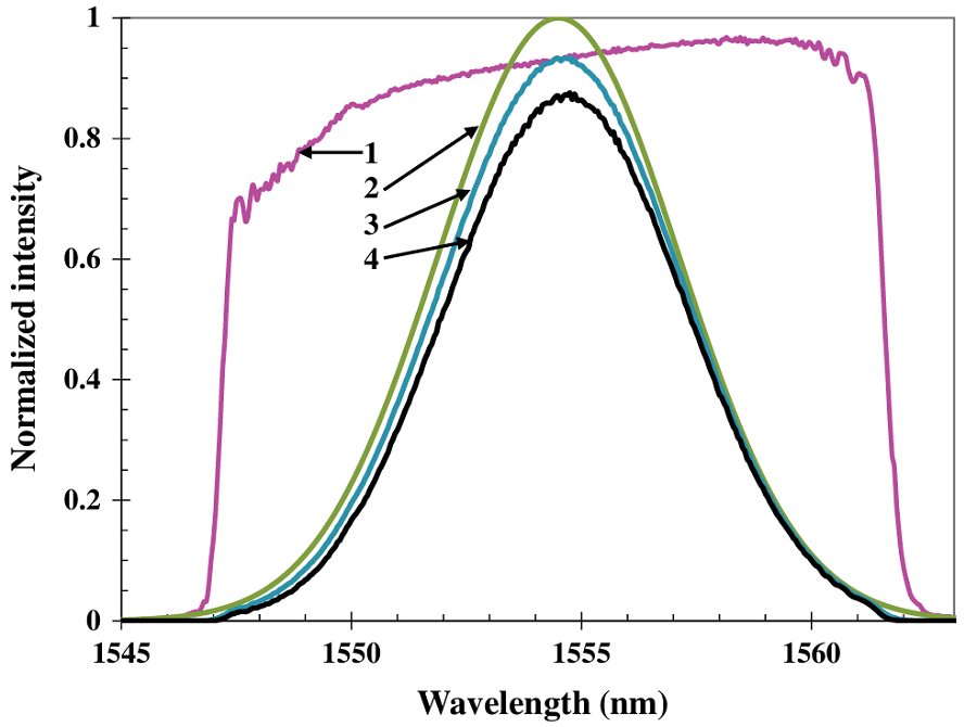 图5(曲线1)展示了中心波长为1555nm的CBG的实验衍射光谱。可以看出,短波长处的绝对衍射效率(相对衍射效率和损耗的组合)低于长波长处。实验证实,由空间折射率调制决定的相对衍射效率对于所有光谱分量均相同,衍射光谱的不对称性是由损耗引起的。然而,这种不对称性并非由相应的吸收或散射光谱的不对称性(在该窄光谱区域内,吸收或散射光谱是平坦的)所致,而是由于从具有较大光栅周期的一端(图2(c)中的左侧)照射CBG所致,该端被称为“红端”。在这种情况下,波长较短的光谱分量传播距离更长,损耗也更大。从“蓝端”照射同一CBG会导致更高的损耗,并且长波长光谱分量的绝对衍射效率更低。因此,测量 CBG 的各项参数时,应分别从“红端”或“蓝端”照射光。由于该CBG依次从两端照射,因此顺序拉伸和压缩可产生对称光谱。值得注意的是,CBG的反射光谱接近于平面轮廓,而脉冲激光器的发射光谱接近于高斯形状(图 5)。这意味着,为了有效反射激光系统的整个光谱(由高斯函数的半峰全宽(FWHM)决定),CBG 的光谱宽度应约为平面轮廓FWHM的两倍。