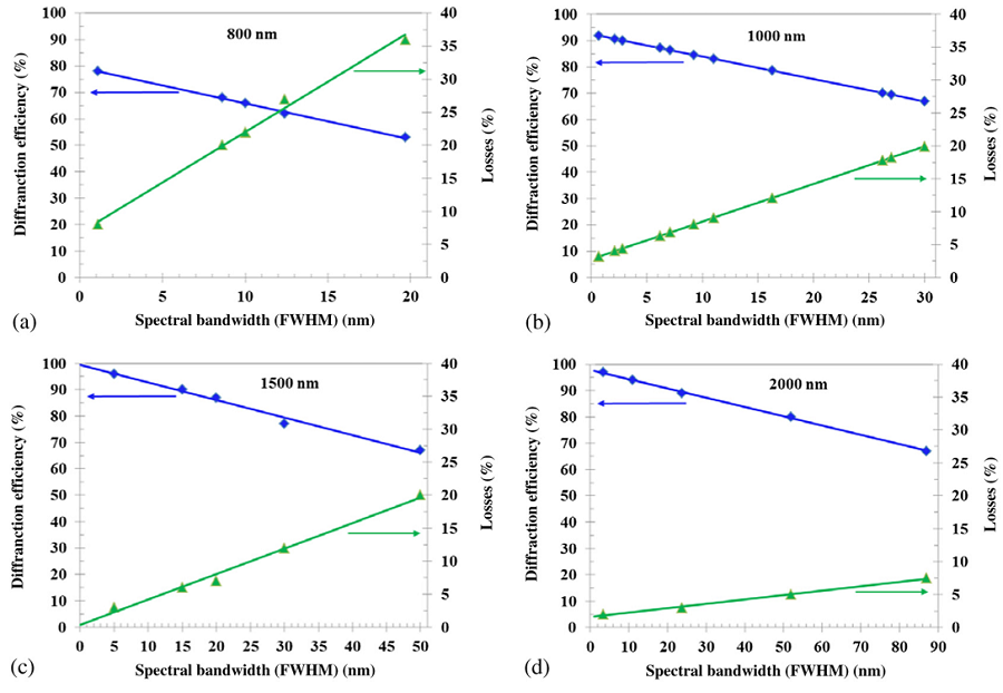图1: 不同波长下,啁啾体布拉格光栅在不同光谱带宽下的衍射效率与损耗特性图示