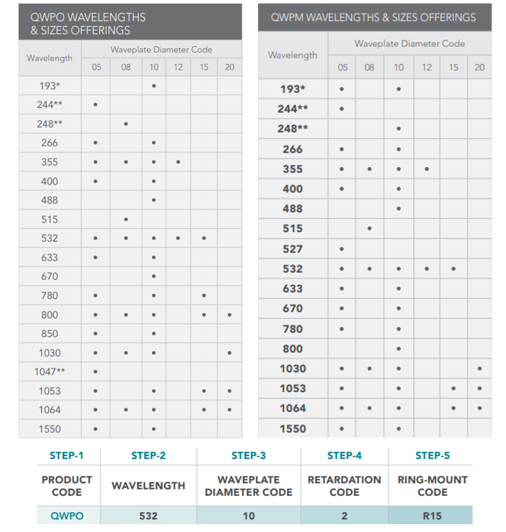 CVI QWPO和QWPM系列的标准品设计覆盖了紫外到近红外波段,重点型号的波段在Nd:YAG激光器及其倍频波段266/355/532/1064nm。此外,CVI还提供193/248nm准分子激光波段和800nm钛蓝宝石激光波段的产品。另外的常见波段如244/400/488/515/527/633/670/780/1030/1550nm。