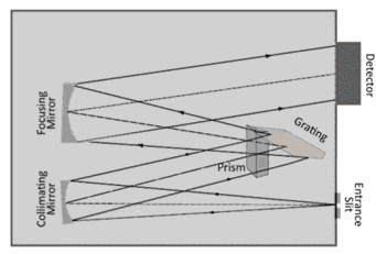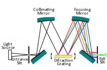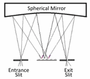 法斯蒂-埃伯特单色仪具有大型球面镜和平面衍射光栅。在这种装置中,球面镜的一部分在光到达平面光栅之前对入射光进行了准直。光栅随后将光线分散到其组成波长中。该球面镜随后聚焦这些色散光,所需波长带内的光被引导到探测器或出口狭缝。这种布置确保了高光谱分辨率和精确的波长分离,非常适合进行详细的光谱测量,但由于系统像差,在保持图像质量方面存在一定限制。