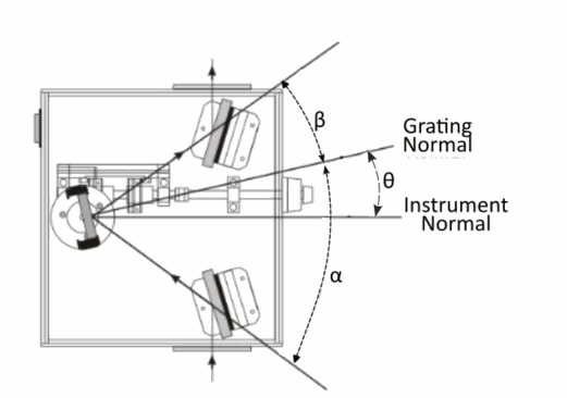 光栅方程为:mλ = d[sin(α)- sin(β)] ,其中m=衍射阶,d=光栅槽间的间距,Θ=相对于中心单色仪轴的光栅角,α=相对于光栅法线的入射角,β=相对于光栅法线的衍射角度。该方程可以重写为:mλ=2dcos(Φ/2)sin(Θ+Θo) ,其中α+ß=Φ,Θ=光栅角。为了使镜面反射(零阶衍射)在所需位置退出,光栅必须呈Θo的角度。在对称单色仪中,Φ =2A,Θo= 0。