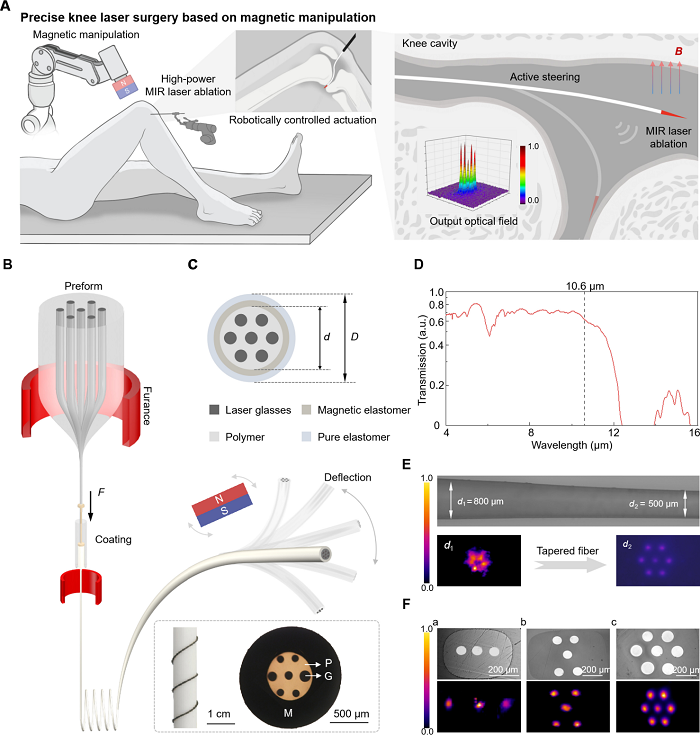 (A) 磁驱多材料纤维机器人进行膝关节激光手术的示意图。纤维机器人通过微小切口进入人体,在外加磁场(B)驱动下实现在狭窄膝关节间隙中的导航与转向,继而输出中红外激光消融病灶。激光输出方向通过磁场(B)调控以实现精准消融。上图插图为输出光场的三维图像。