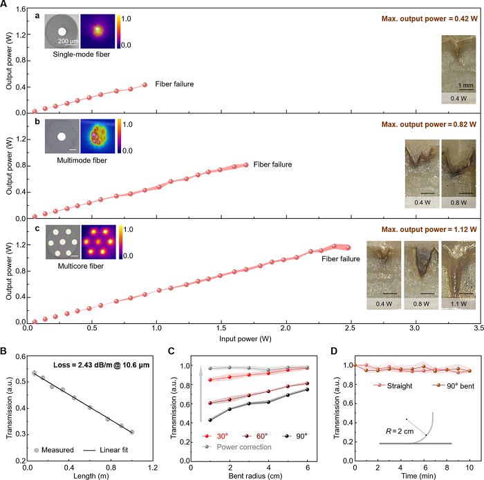 (A) 单模光纤(n=3个独立样本)、多模光纤(n=3个独立样本)及多芯单模光纤(n=3个独立样本)的传输性能。(a)(b)(c)左上角插图分别对应单模光纤、多模光纤与多芯光纤的横截面及输出中红外光场;右侧插图为不同功率下离体猪软骨组织的消融截面。max.表示最大值。