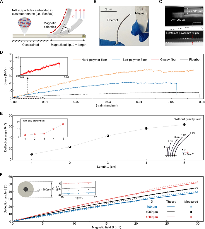在磁驱纤维机器人的临床操控中,对其磁场响应性、安全性、疏水性及柔韧性均有严格要求。纤维机器人由外部磁弹性体基质、内部激光玻璃和热塑性聚合物构成。外部磁弹性体基质赋予其磁响应能力,磁性源于嵌入弹性体基质中的硬磁钕铁硼颗粒(图3A)。L表示纤维机器人的无约束长度,可通过外部磁场(如永磁体或电磁体)进行操控(详见图3B和影片S1)。此外,最外层的纯弹性体包覆层为纤维机器人提供了安全性与疏水性(图3C)。在均匀磁场(B)中,纤维机器人的偏转角度(θ)遵循基本公式,可表示为(14,34,47):