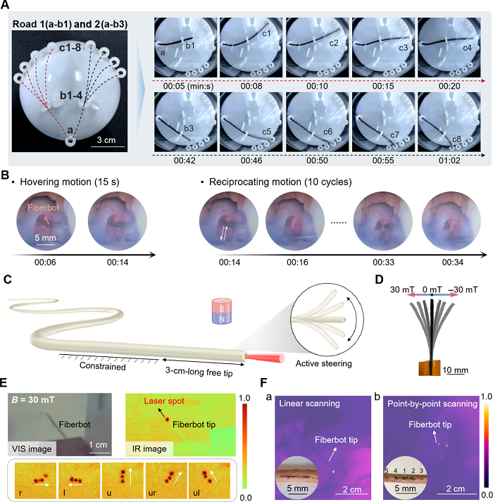 (C) 采用柔性磁驱纤维机器人的可操控中红外激光消融实验装置。纤维机器人无约束段长度为3厘米。