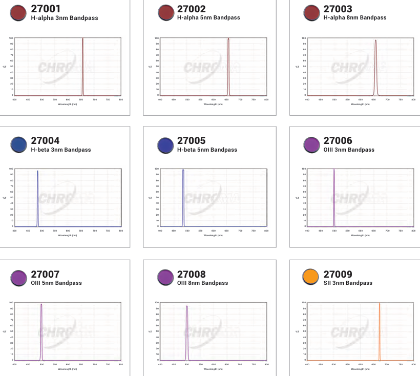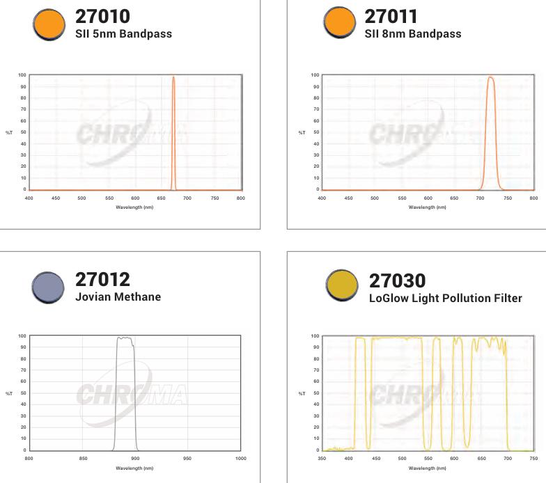 Chroma天文滤镜均采用3.0 毫米厚的基板镀膜,并与其他Astronomy Filters共焦,但除了LoGlow 光污染滤镜 (27030),该滤光片采用1.1mm厚的LCD基板制造。所有的天文滤光片均采用优质玻璃单层基板,并使用耐用的溅射硬质镀膜工艺制造。所有主滤镜镀膜均涂覆于正面,而防反射镀膜涂覆于背面,以防止重影并最大限度地提高透射率。天文滤光片专为CCD相机设计,适用于f/4.0或更小光圈。透射波前优于0.25波长/英寸,包含H-alpha滤光片,H-beta滤光片,SII滤光片,OIII滤光片等。