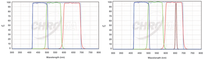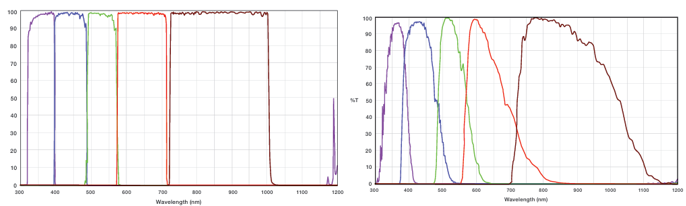 上图左为天文滤光片27101 LRGB,右为27102 HaLRGB的透过率曲线