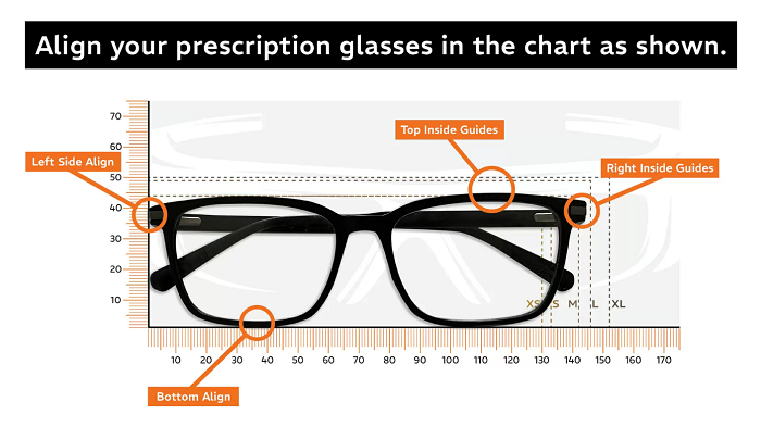 将近视眼镜放置于尺寸对照表上进行测量,测量结果将决定所需的叠戴镜尺寸,并引导您选择表格中合适的近视眼激光护目镜镜框款式。