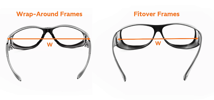 叠戴/贴合式(fitover)镜框专为紧密覆盖近视眼镜设计,其尺寸较环绕式略大更宽,故尺寸标注与环绕式存在差异。