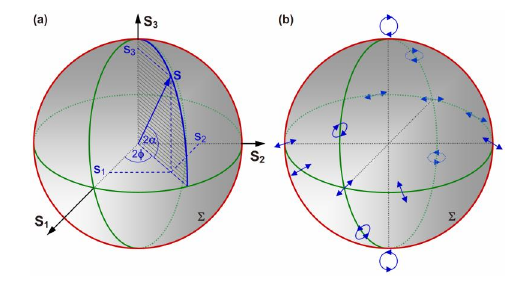 庞加莱球。(a)为庞加莱球的坐标,(b)庞加莱球表面的偏振态分布