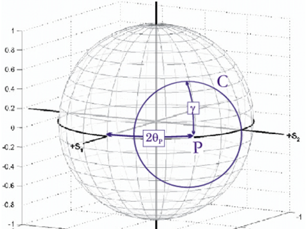 通过这种方式将斯托克斯参量表示在一个球上,这个球被称为庞加莱球。其中球的经度为2φ,纬度为2α。