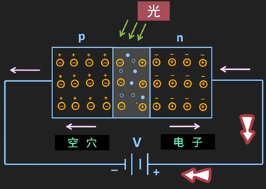 光电二极管是一种由P型半导体与N型半导体组成的PN结构器件。与普通二极管一样,光电二极管同样具备反向偏压下高电阻特性,与之不同的是光电二极管具备更大的PN结面积,用于更好的吸收光。在反向偏压时,当具有足够能量的光子照射到PN结时,它会生成一个电子-空穴对,此时受到PN结内建电场的影响,电子会穿过耗尽区后在外置电场作用下向N极移动。空穴向P极移动,电子向N极移动,从而产生光电流。