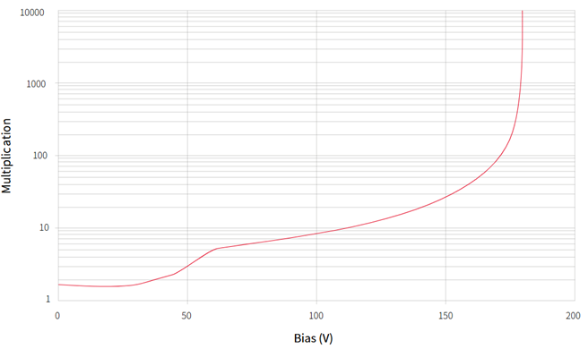 与其他光电二极管相比,铟镓砷二极管适合在高反向偏置条件下工作。通过光子撞击或光子形成的电荷载流子使雪崩倍增。雪崩作用可使光电二极管的增益提高数倍,以提供高灵敏度范围。在传统光电二极管中,当反向偏置过大形成雪崩击穿时候会损坏二极管,会在正常使用的时候避免超过此电压。而 APD 允许一定条件下的反向击穿,利用雪崩效应实现电的放大。在 APD 中,被光释放的电荷载流子在电场中被加速,通过碰撞电离产生更多的电子-空穴对。如果反向偏置电压低于击穿电压,则由于摩擦损耗,雪崩效应会逐渐消失。此时,单个光子已产生数百甚至数千个电子。当电压高于击穿电压时,电荷载流子的加速度足以维持雪崩效应。单个光子即可产生可由外部电子设备测量的恒定电流。