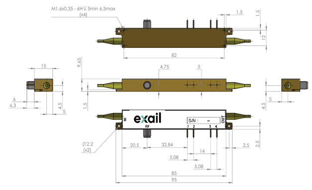 IN,OUT:保偏光纤,康宁PM15-U25D型,长度:1.5m,缓冲层直径:900um。RF:MX-LN-0.1/5/10:K型母头(兼容SMA),MX-LN-20:K型母头或2.4mm,MX-LN-40:2.4mm母头兼容V/1.85mm连接器。端口1、2、3、4:穿心引脚,直径1.0mm。