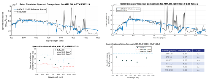 下图中左边为3A级太阳光模拟器的光谱匹配度情况,右边为超越AAA级太阳光模拟器的光谱匹配度情况。将A+A+A+级太阳光模拟器SciSun-A+的实测输出光谱(黑线)与ASTM G173-03国际标准光谱(蓝线)进行直接比对,黑线与蓝线在整个300-1200nm波长范围内比3A级太阳光模拟器在400-1100nm内更重合,表明SciSun-A+太阳能模拟器的光谱匹配度更好。SciSun-A+太阳能模拟器的光谱匹配度极佳,能够精确复现自然太阳光的光谱分布,这对于光伏器件效率测试的准确性至关重要。