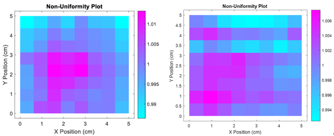 下图中左边为3A级太阳光模拟器的辐照度均匀性情况,右边为A+A+A+级太阳光模拟器的辐照度均匀性情况。3A级太阳光模拟器的辐照度在0.30cm²辐照面积内的空间非均匀性为0.006个太阳,SciSun-A+太阳能模拟器的辐照度在0.391cm²辐照面积内的空间非均匀性为0.0035个太阳。由此可见,SciSun-A+太阳能模拟器的辐照度均匀性更好。