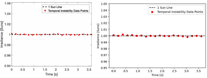 下图中左边为3A级太阳光模拟器的辐照度时间稳定性情况,右边为A+A+A+级太阳光模拟器的辐照度时间稳定性情况。在相同探测面积4cm²和20个测试点的情况下,3A级太阳光模拟器的数据点间隔时间为0.253秒,最大辐照度1.002个太阳,最小辐照度0.999个太阳,辐照度时间不稳定性0.13%;而A+A+A+级太阳光模拟器的数据点间隔时间为0.19秒,最大辐照度1.0019个太阳,最小辐照度0.998个太阳,辐照度时间不稳定性0.19%,长期不稳定性0.19%,短期不稳定性0.1%。