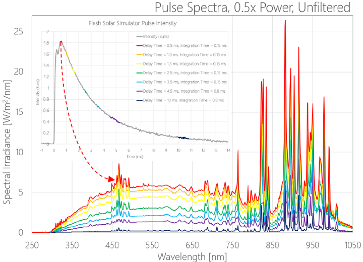 SciPulseSpec光谱辐射计快速响应的特点使其特别适合测量脉冲毫秒级光谱。SciPulseSpec光谱辐射计专为测量1个太阳光照强度,配套太阳光模拟器使用。由上图可以看出,随着延迟时间的增加,所有波长的光强均急剧下降,当延迟时间为0.5ms时,SciPulseSpec太阳光光谱辐射计测得的太阳强度为1.8,而延迟时间为10ms时,太阳强度仅为0.15。光谱形状在信号可测的延迟时间内(0.5ms-3.5ms),光谱形状几乎保持一致。延迟时间4.5ms或者10ms时,信号值很低,积分时间被延长至0.8ms,此前为 0.15ms。
