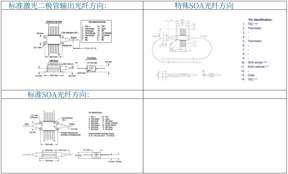 注意:如果使用SOA驱动,请确保SOA按正确方向安装。参考SOA的引脚(下方,右侧)并与标准Type1激光二极管(下方,左侧)进行比较,验证SOA正极和负极是否连接到SOA驱动正确的焊盘: