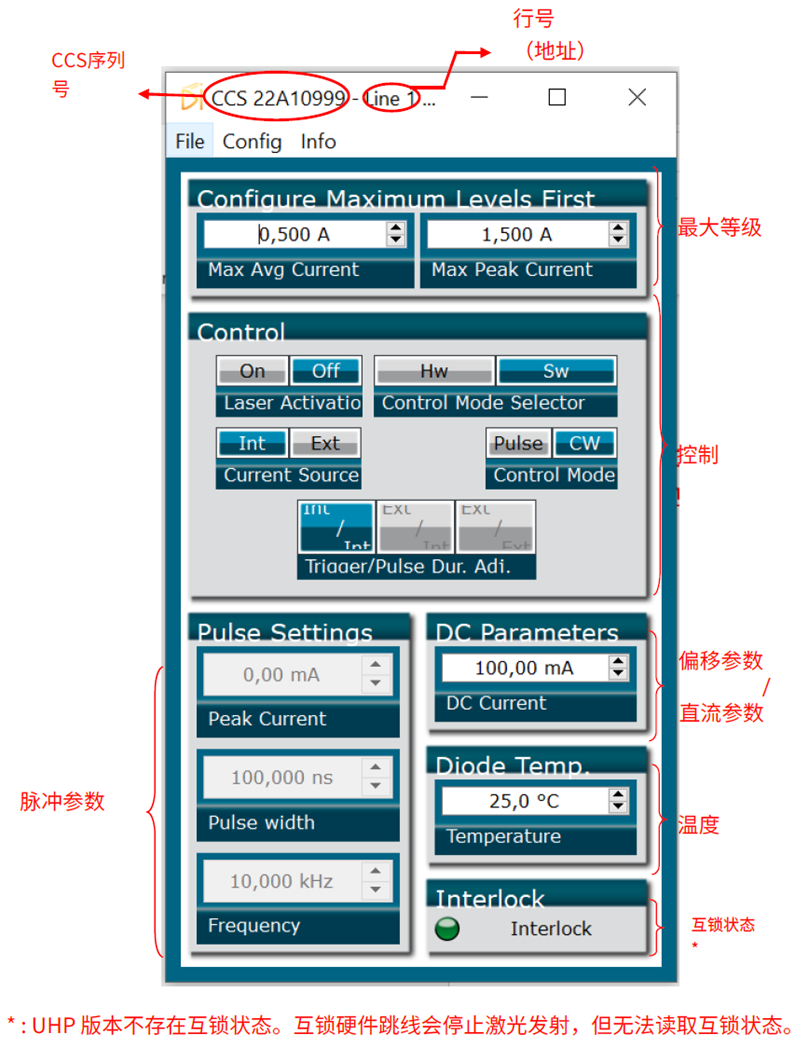 在将激光二极管插入CCS插座之前,请将这些值配置为激光二极管供应商推荐的最大值。默认情况下,这些值被设置为0,因此驱动器不会提供电流。您必须更改这些值以启用驱动器输出。
