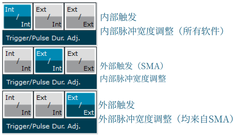 - 如果选择Ext/Int,则信号由SMA输入上的数字信号从外部触发。脉冲宽度由软件配置。