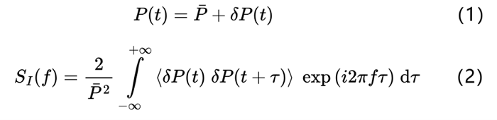 在激光噪声(即光功率起伏)的描述中,通常采用相对强度噪声(RIN)这一指标。相对强度噪声表征的是激光输出功率相对于其平均功率的波动程度,一般以功率谱密度PSD随噪声频率变化的形式来表示。激光的光功率可由公式 (1) 给出,表达式中包含平均功率项,以及一个均值为零的波动分量δP。相对强度是δP除以平均功率;在以下内容中,该量被称为I。相对强度噪声可以以不同的方式指定;一种常见的方法是使用公式(2),单边功率谱密度(PSD)对其进行统计描述。