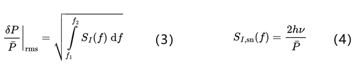 PSD 也可以在噪声频率的某个区间[f1, f2]上积分,以获得相对强度噪声的均方根(r.m.s.)值,这通常以百分比表示。见公式(3)。此外,如果不明确说明是指均方根值还是其他值,那么用百分比来表示相对强度噪声(例如±0.5%)是不合理的。