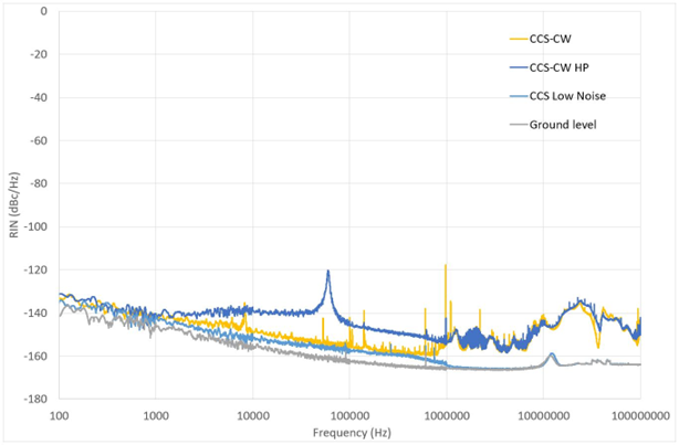 AeroDIODE不同系列的驱动器相对噪声频谱。横坐标是激光二极管驱动器可调制的频率范围,从100Hz到100MHz,纵坐标是RIN;可以注意到,当频率在1MHz以上时,AeroDIODE的低噪声驱动器的RIN达到了-165 dB/Hz,基本与驱动器地线重合此外,还存在由弛豫振荡引起的峰值。AeroDIODE的低噪声驱动器的噪声水平可与行业最低噪声电池驱动器相媲美。