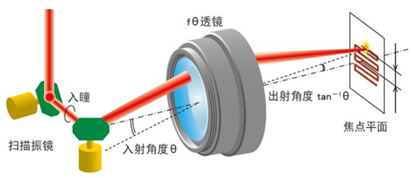 在普通的透镜中激光光束以角度θ入射到透镜时,在焦点平面上的f·tanθ的位置形成光斑。θ比较小时光斑到光轴的距离×与θ几乎成正比,θ变大时,将不成比例。二氧化碳F-Theta镜利用透镜的畸变效果,相对于入射角θ使其出射角度为tan-1θ,即使θ变大,也能保持入射角度和焦点平面上的光斑到光轴距离成简单比例关系。因此,利用扫描振镜等的等速旋转运动而扫描的激光光束,不需要电气校正,在焦点平面上可形成等速直线运动的光斑。