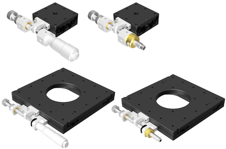 超薄X轴不锈钢平台型号末尾为FP的产品,采用的是精密调整螺杆,请注意不是一般的微分头。精密调整螺杆的螺距为0.25mm,在操作时请使用六角扳手或另售的六角手轮扳手(KCL)。另外,还备有10mm厚度的超薄θ轴中空转动平台(台面尺寸120×120mm的厚度为16mm)。