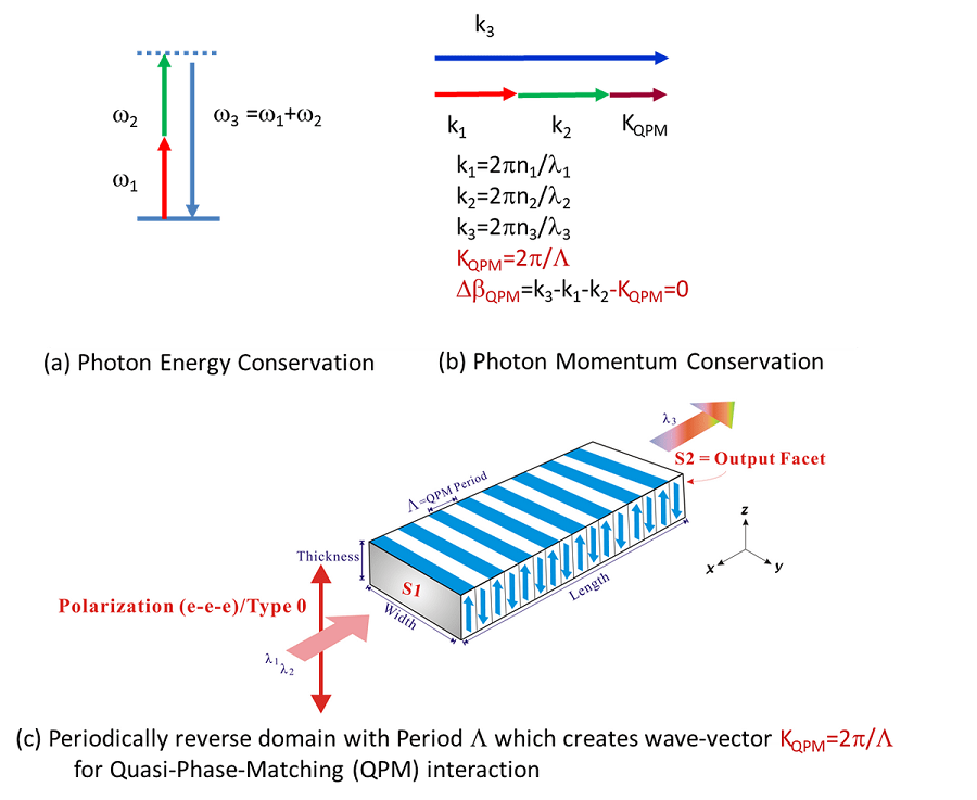 在高效的波混频过程中,必须满足以下两个条件:(a)光子能量守恒和(b)光子动量守恒。其中,(c)光子动量守恒是通过创建一个波矢量来补偿混频波之间的波矢量失配来实现的。