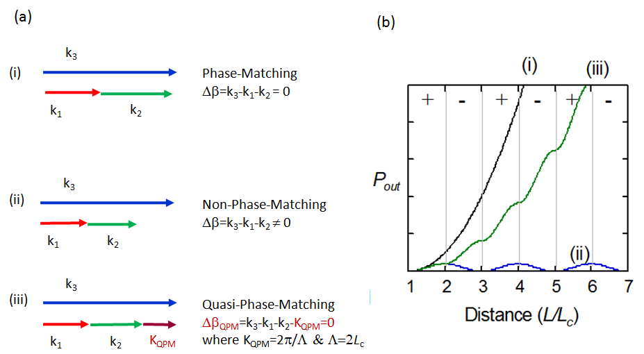 在(i)相位匹配、(ii)非相位匹配和(iii)准相位匹配相互作用下,转换输出功率随距离增长,+ 和 – 符号表示非线性极化率符号。