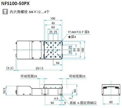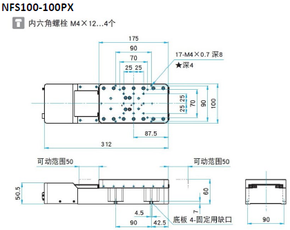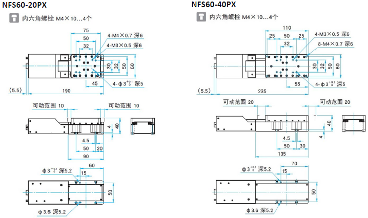 下面将NFS60-20PX,NFS60-40PX,NFS100-50PX,NFS120-50PX,NFS100-100PX,NFS120-100PX,NFS180-200PX和NFS180-300PX一共8种OptoSigma闭环电动平移台的外形参数图纸,供客户进行参考和测量。