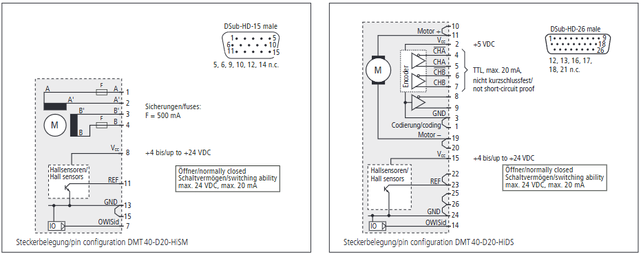德国owis的DMT 40系列电动旋转台DMT 40-D20-HiSM和DMT 40-D20-HiDS本身是为其40系列的固定导轨设计的电动控制旋转位移台,但是其良好的精度和40mm的定量宽度为其在不同光学平台上的固定和使用提供了良好的接口规格。OWIS的DMT 40系列电动控制旋转位移台的2相步进电机旋转测量台DMT 40-D20-HiSM或带编码器直流电机旋转测量台DMT 40-D20-HiDS的选择多样性同时欧维斯为客户在针对不同的应用场景提供了多样化的选择。对于不同的电机选择,其中的电路原理和接口型号也会有不同的变化,此处将OWIS的2相步进电机型号电动旋转台DMT 40-D20-HiSM和编码器直流电机型号旋转测量台DMT 40-D20-HiDS电机部分电路和规格放在下图,供客户进行参考。