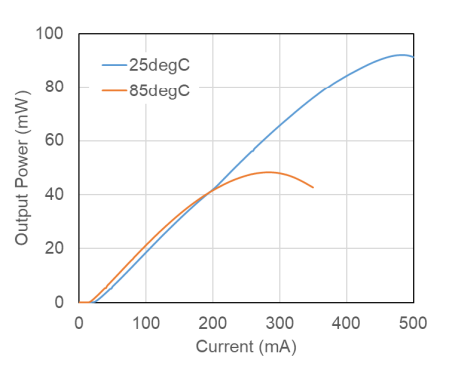 图3展示了量子点DFB(分布式反馈)激光器的典型光电流特性,在25°C时获得了90 mW的高光输出功率,在85°C时获得了40 mW的高光输出功率。
