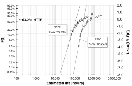 图5展示了可靠性测试的结果,在85°C和95°C下的平均故障时间(MTTF)分别估计为280,000小时和112,000小时,这表明其在实际应用中具有足够的可靠性。在“量子阱”激光器中,由于电流或光在运行过程中产生的应力,活性层中会产生位错,位错会在连续的活性层平面上传播,导致快速退化。而在“量子点”激光器中,每个量子点在空间上是分离的,位错不会传播到周围区域,因此被认为具有高可靠性。