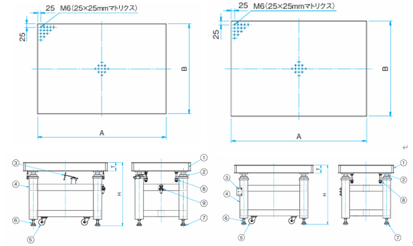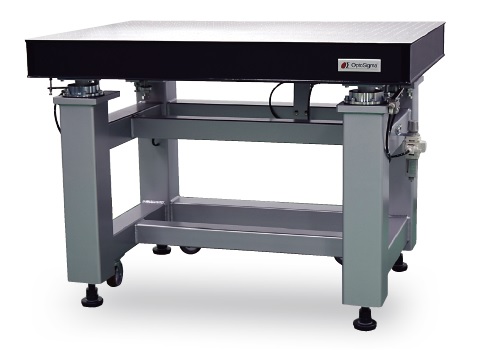 Optosigma空气弹簧隔振平台的表面板呈蜂窝状,由铝制成,具有重量轻、高刚度、高阻尼等优点。气浮隔震平台表面由由磁化不锈钢制成,整个表面有螺纹孔(M6 25×25mm 矩阵),因此可以使用磁性和螺钉式装置和设备构建。