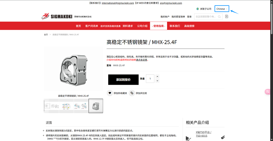 但是,由于西格玛光机的中文网页仍未完善,因此按照产品名称,型号和关键字的西格玛产品搜索只适用于搜索产品型号,搜索词少于两个字将无法搜索,如透镜。搜索反射镜也只会显示反射镜镜架等其他关联产品,搜索不到反射镜。
