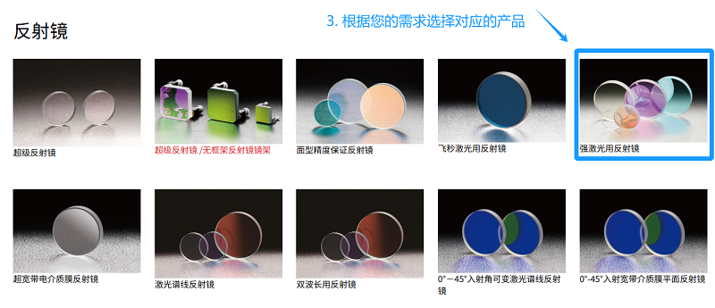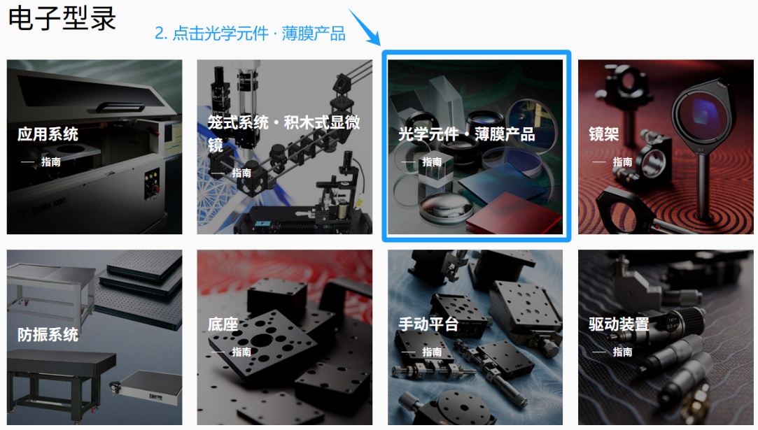 此处,我们以反射镜为例,在电子型录中点击光学元件·薄膜产品,然后根据需要选择合适的产品。