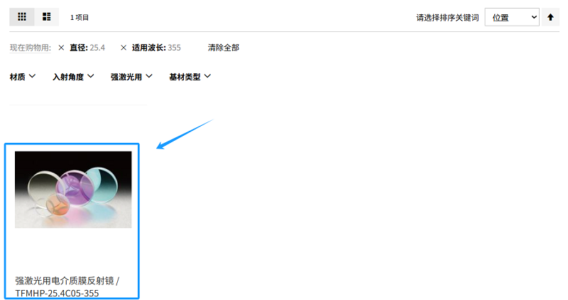以强激光用电介质膜反射镜为例,为了筛选您所需的产品,您可以使用西格玛产品搜索的产品规格精选按钮。比如我们需要355nm,直径25.4mm的强激光用电介质膜反射镜,只需选择点击的按钮进行筛选即可。这样我们就可以选出我们所需的强激光用电介质膜反射镜型号TFMHP-25.4C05-355了。