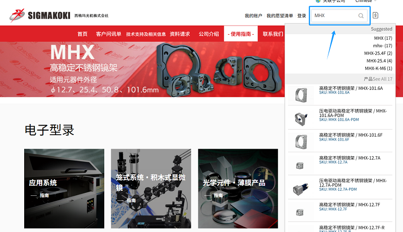 本文旨介绍西格玛光机Optosigma网页的西格玛产品搜索使用方法,教您如何在西格玛光机快速找到所需要的产品,并且可以查询西格玛光机产品价格。有两种方法来搜寻您所需的产品,分别是按照产品类别搜索,在西格玛产品搜索框按照产品名称,型号和关键字搜索。此外可以通过网页的西格玛产品比较来对比两个西格玛光机Optosigma的产品之间的异同,并且举了MHX-25.4F和MHX-50.8A例子来说明如何使用西格玛产品比较功能。