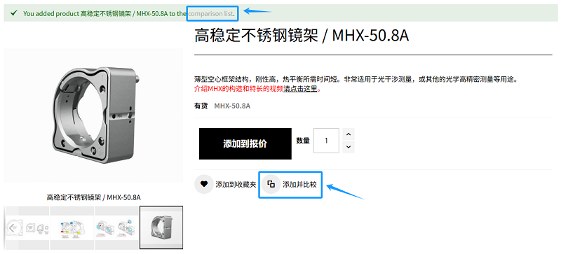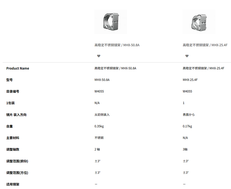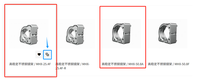 在西格玛光机Optosigma的产品页中,您可以选择不同型号的产品进行比较。此处我们以镜架为例,选择MHX系列高稳镜架的MHX-25.4F和MHX-50.8A进行比较。在一览显示或个别显示时点击“添加到比较列表”图标以添加到西格玛产品比较列表。选择了两个产品之后,点击“comparison list”,即可进入西格玛产品比较列表,以查看MHX-25.4F和MHX-50.8A的异同了。