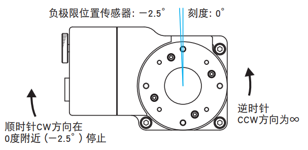 逆时针转动CCW方向为∞,顺时针转动CW方向在0度附近(-2.5°)停止 |