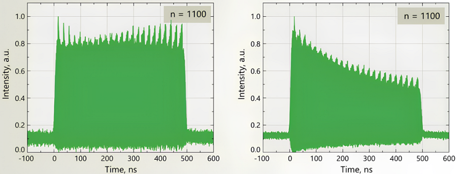 图3(右):Long GHz burst任意整形-233 KHz重频的burst波包,包含1100个2.2GHz的小脉冲,能量逐渐下降的形状
