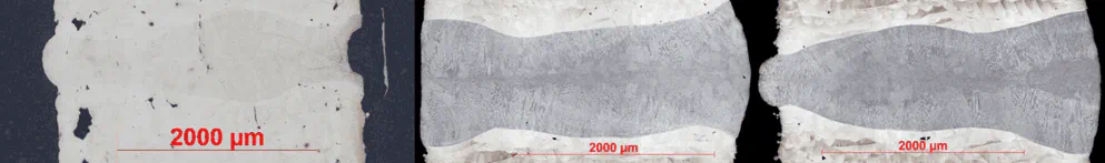 焊接高斯光束(左)、平顶(中)和圆环(右)。工艺稳定性的提高导致了均匀的焊道和膨胀。