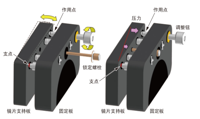镜片支持板锁定机构,松开锁定螺栓,调整角度。拧紧锁定螺栓,支点等处压力增大,镜片支持板被固定。但是,继续调节的话,此锁定会自动解除。