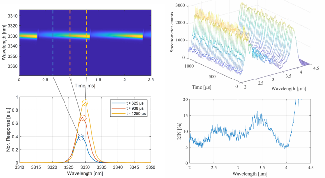 2.0-5.0μm红外光谱仪具备130kHz的超高光谱采集速率,是激光光源超快光谱表征的理想选择。如下图所示典型应用案例:左侧图表展示了3330nm激光器在1kHz驱动电流调制下的光谱特性(测量速率80kHz),在一个调制周期内,出射光强逐渐增强,同时中心波长发生偏移,数据清晰呈现了激光输出功率与波长随调制信号的同步变化。右侧图表则针对40kHz重复频率的中红外超连续光源进行了80kHz单脉冲测量:上图显示了2-4.5μm波段内50个连续脉冲的光谱序列(时间轴单位为微秒,空白谱线已隐藏);下图则基于该数据计算得到的相对强度噪声(RIN)谱密度。凭借卓越的灵敏度和快速读出性能,中红外光谱仪光谱仪可广泛应用于各类激光器快速表征场景。