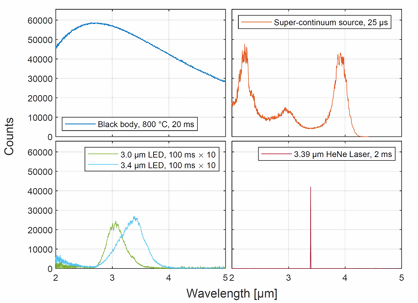 NLIR光谱技术可实现对多种光源的快速精准测量,如下图所示:(左上)发射率>0.99的800℃黑体辐射源;(右上)中红外超连续光源单脉冲光谱;(左下)两种不同中红外LED的发射光谱;(右下)He-Ne激光器光谱特性。图注中标注了各光谱对应的曝光时间参数