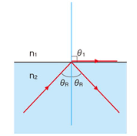 临界角θR=θ2,临界角是光从光密介质(折射率𝑛1)射向光疏介质(折射率n2,且𝑛1>𝑛2)时,发生全反射(Total Internal Reflection, TIR)的最小入射角。当入射角≥临界角时,光不再折射,而是全部反射回原介质。